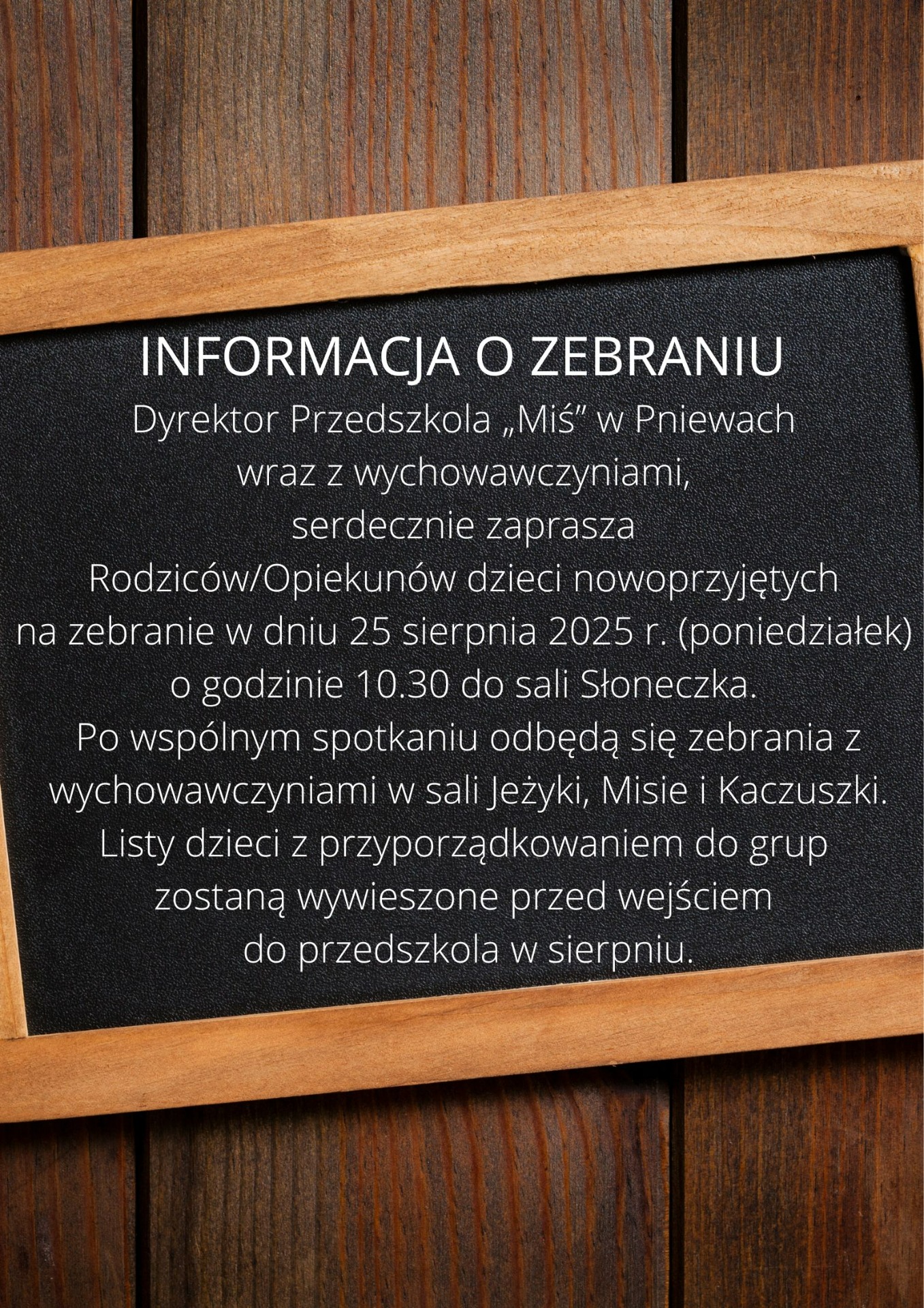 Informacja o zebraniu dla Rodziców/Opiekunów dzieci nowoprzyjętych