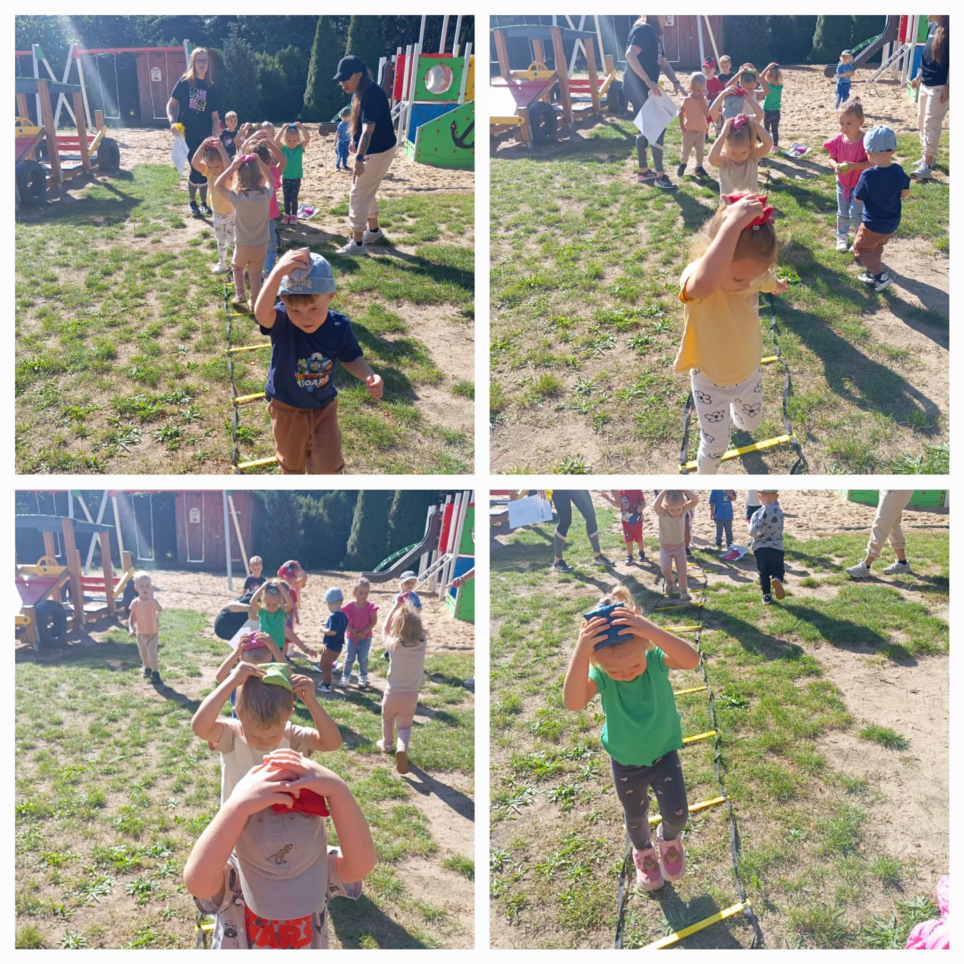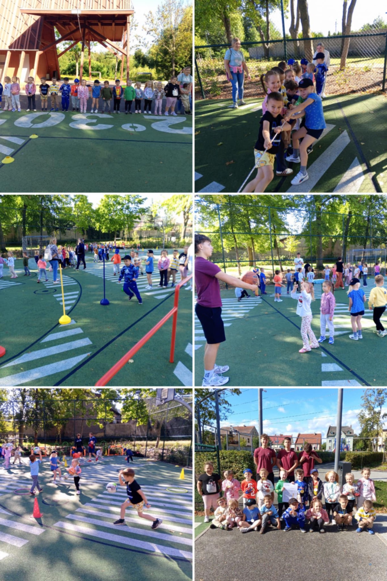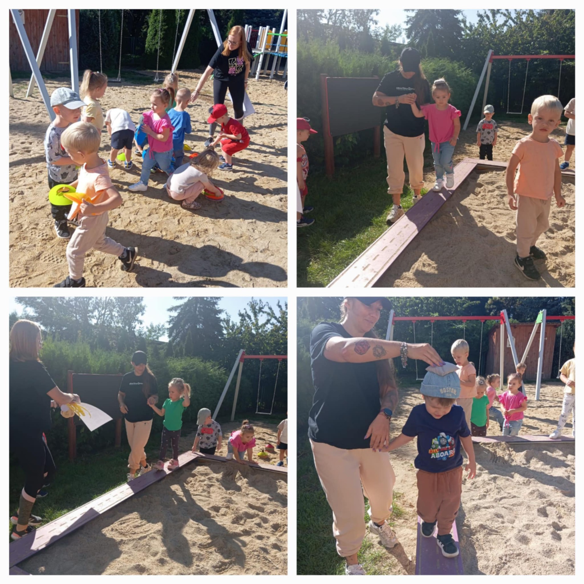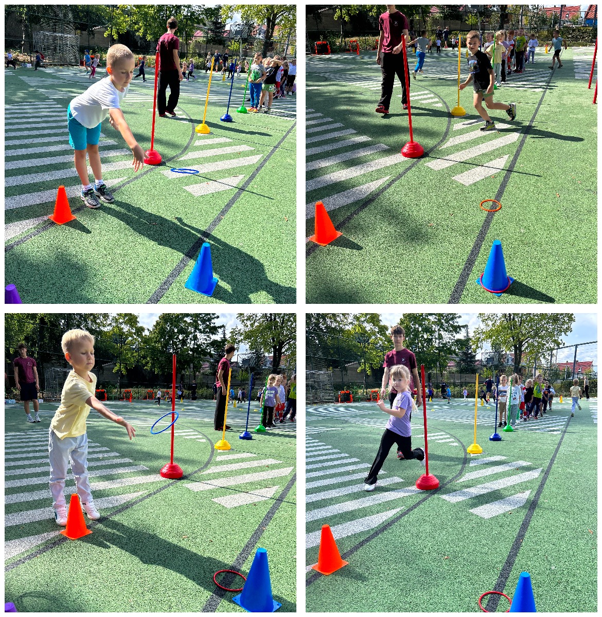 Starsze grupy uczestniczyły w zajęciach sportowych zorganizowanych w Parku Sokoła. Dzięki współpracy z trenerami APR Lampart Pniewy oraz aktywną młodzieżą z naszej gminy m.in. uczniami Zespołu Szkół im. E. Sczanieckiej w Pniewach przedszkolaki mogły spróbować swoich sił w różnorodnych konkurencjach sportowych i poczuć się jak prawdziwi sportowcy. Były biegi, zabawy z piłkami, tory przeszkód oraz ćwiczenia ogólnorozwojowe – wszystko w duchu dobrej zabawy i aktywności na świeżym powietrzu.