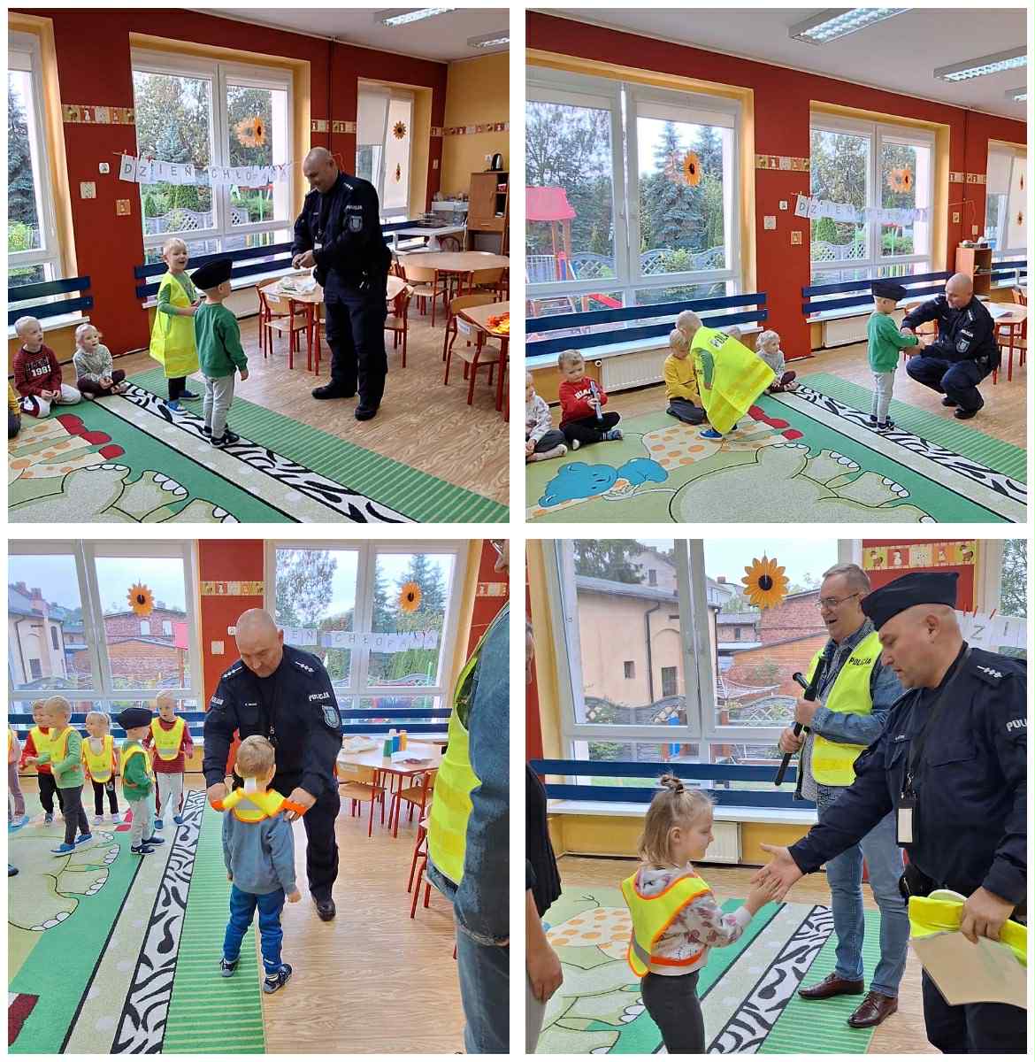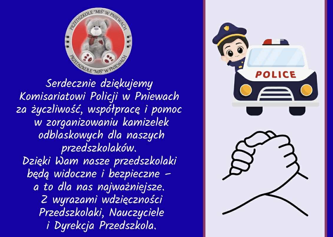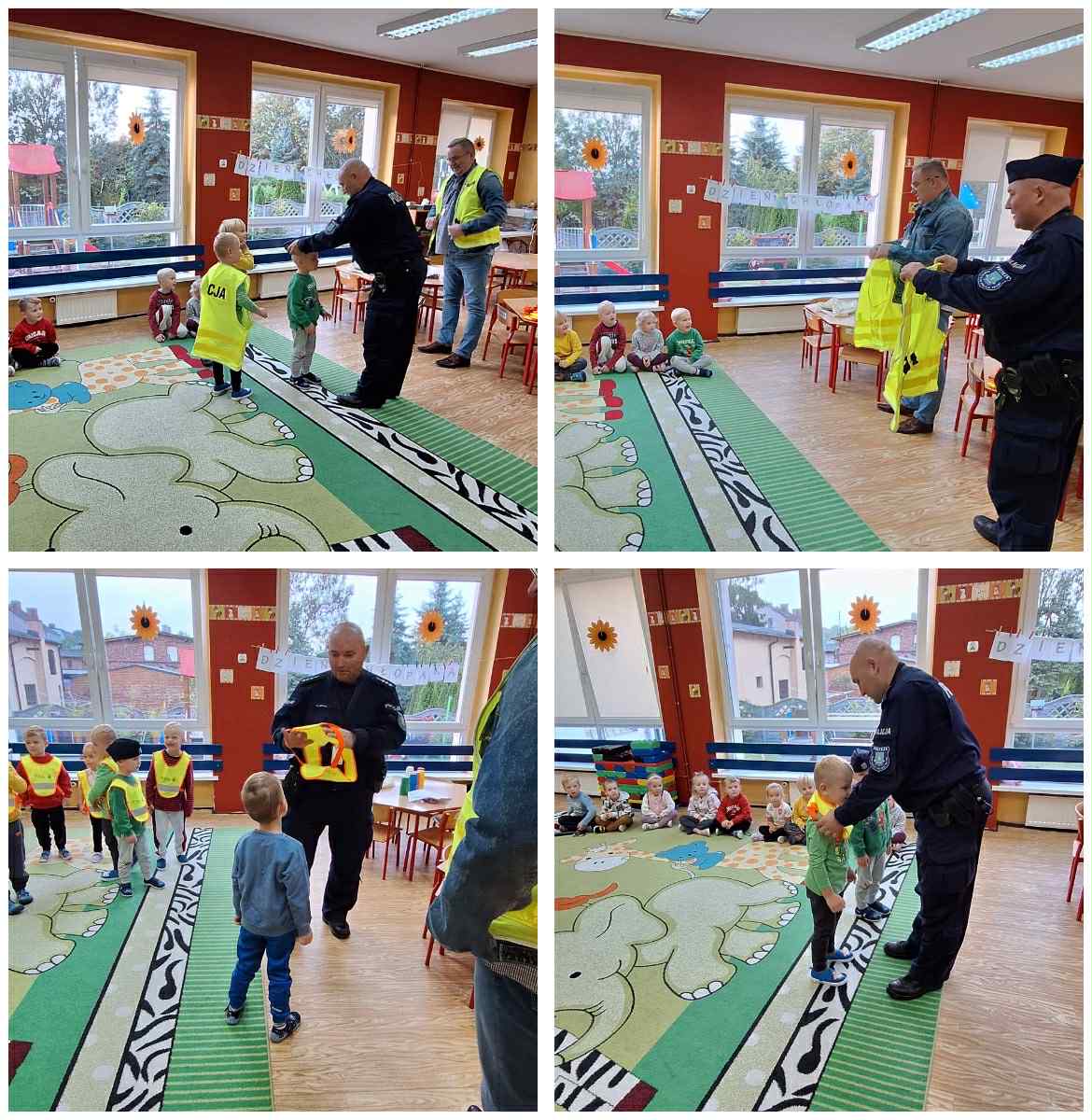 Dziś nasze przedszkolaki z grupy „Słoneczka” miały wyjątkową okazję spotkać się z Komendantem Komisariatu Policji w Pniewach – Panem Dariuszem Serwatą oraz dzielnicowym Panem Krzysztofem Mrozkiem. Podczas wizyty dzieci otrzymały wspaniały prezent – kamizelki odblaskowe, które zadbają o ich widoczność i bezpieczeństwo podczas spacerów i wyjść poza teren przedszkola. 👧🧒💛 Policjanci przeprowadzili również ciekawą pogadankę na temat bezpieczeństwa oraz przybliżyli dzieciom tajniki pracy policjanta. Serdecznie dziękujemy Komendantowi Komisariatu Policji w Pniewach za życzliwość, współpracę i pomoc w zorganizowaniu kamizelek. Dzięki temu nasi najmłodsi mogą czuć się jeszcze bezpieczniej – a to dla nas najważniejsze! 🌞👮♂️✨