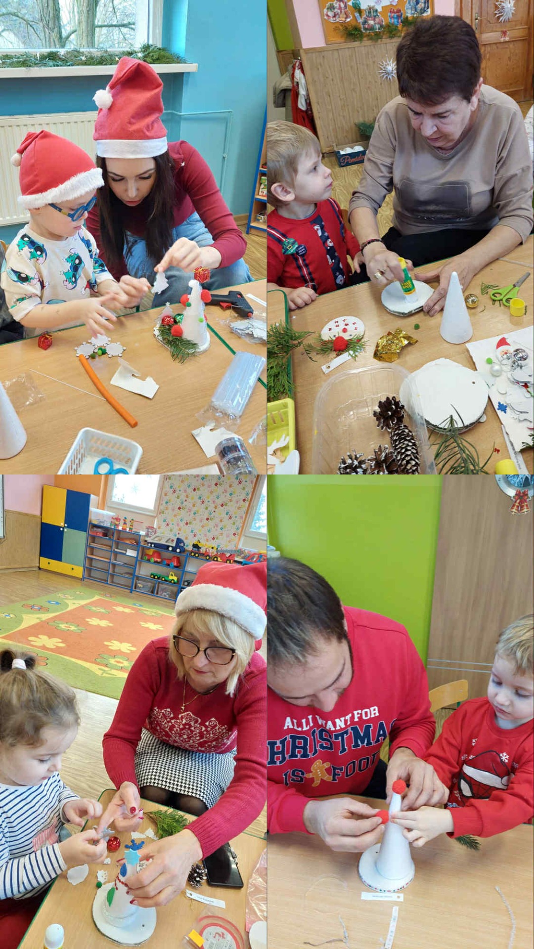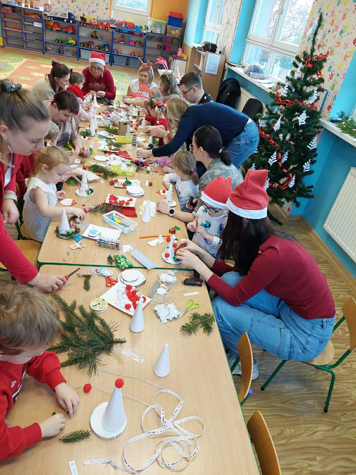W czwartek, 4 grudnia w grupie „Jeżyki” odbyły się warsztaty świąteczne, podczas których dzieci wraz z rodzicami tworzyły wyjątkowe ozdoby na kiermasz świąteczny. W sali panowała radosna, twórcza atmosfera, a uczestnicy z dużym zaangażowaniem wykonywali choinki i inne świąteczne stroiki.