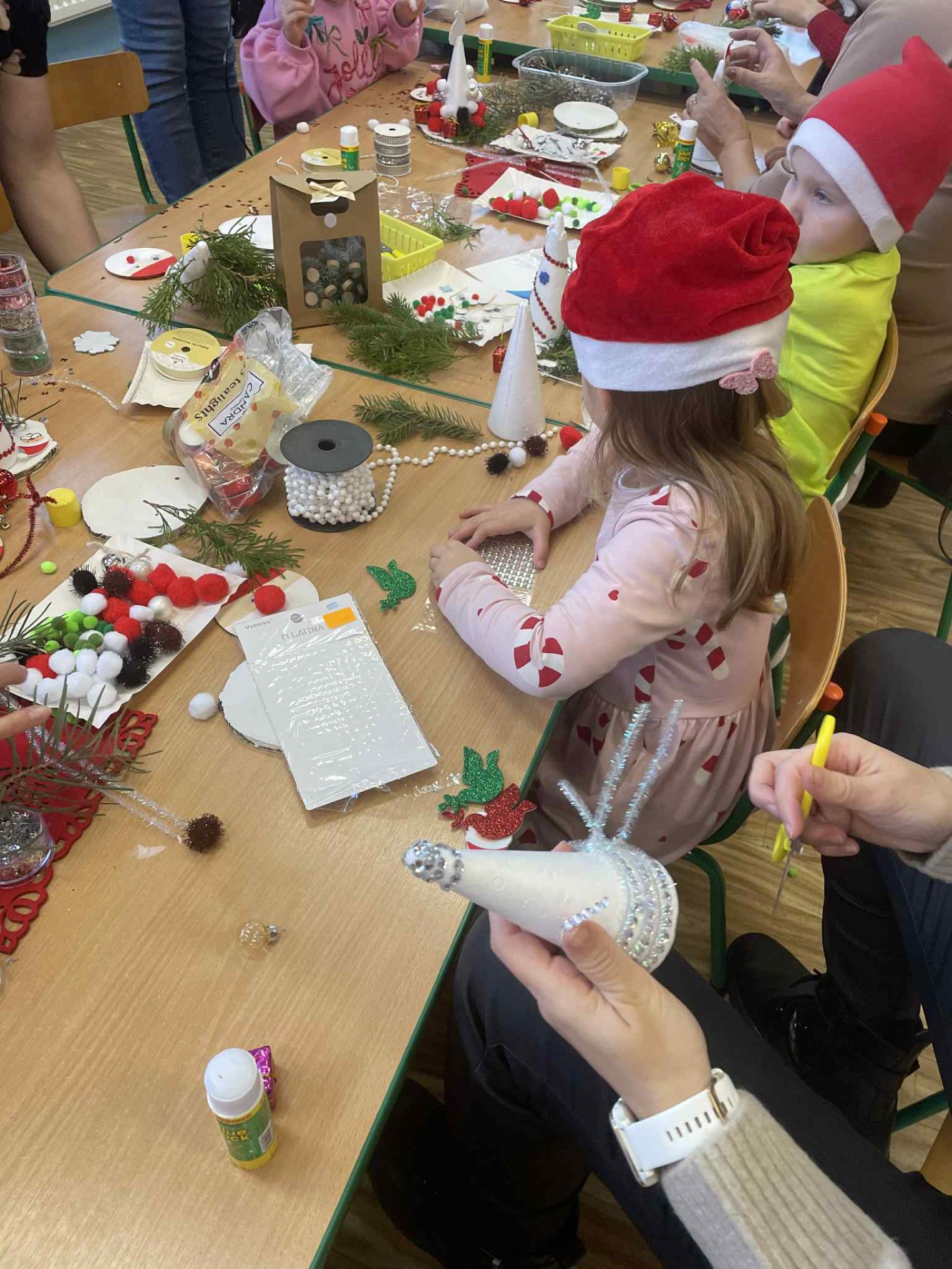 Dzieci z entuzjazmem dobierały świąteczne dekoracje, natomiast rodzice z uśmiechem wspierali je w pracy, dzieląc się swoimi pomysłami i pomagając w tworzeniu małych dzieł sztuki. Był to wyjątkowy moment, który na pewno na długo pozostanie w naszej pamięci. Bardzo dziękujemy wszystkim za udział i aktywność. Mamy nadzieję, że w przyszłości ponownie spotkamy się w równie ciepłej atmosferze.