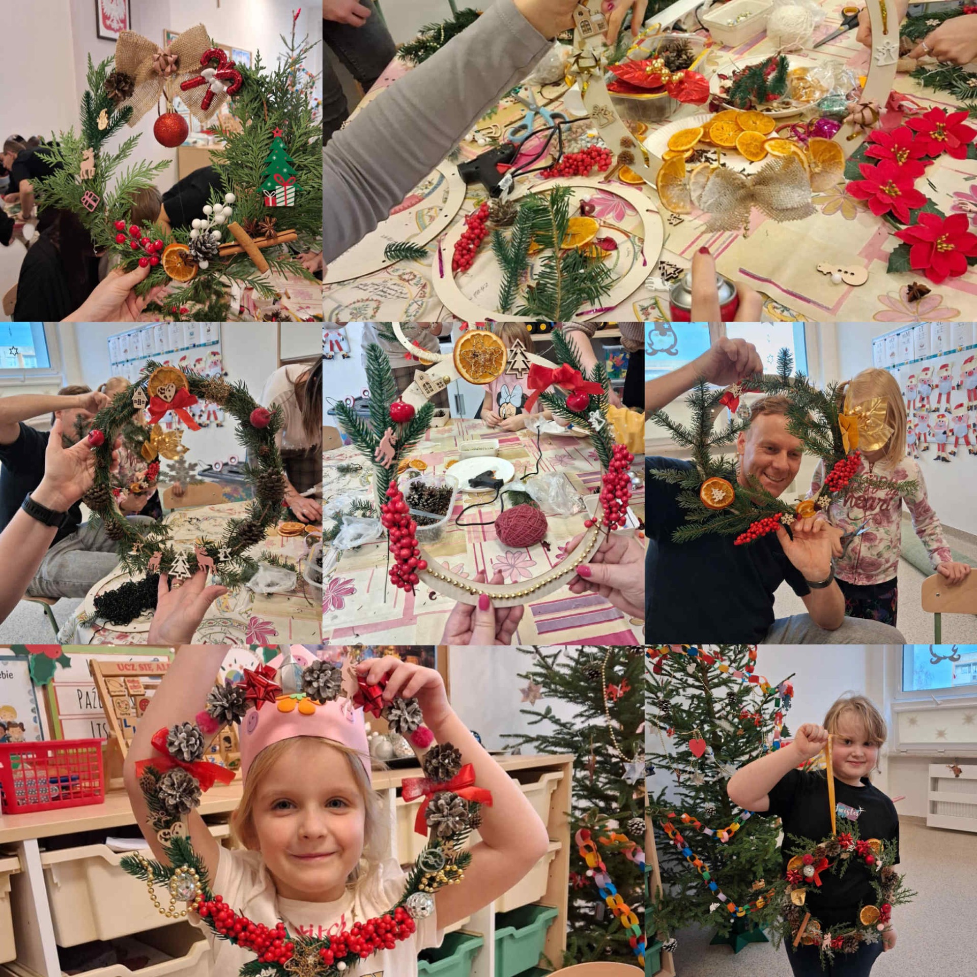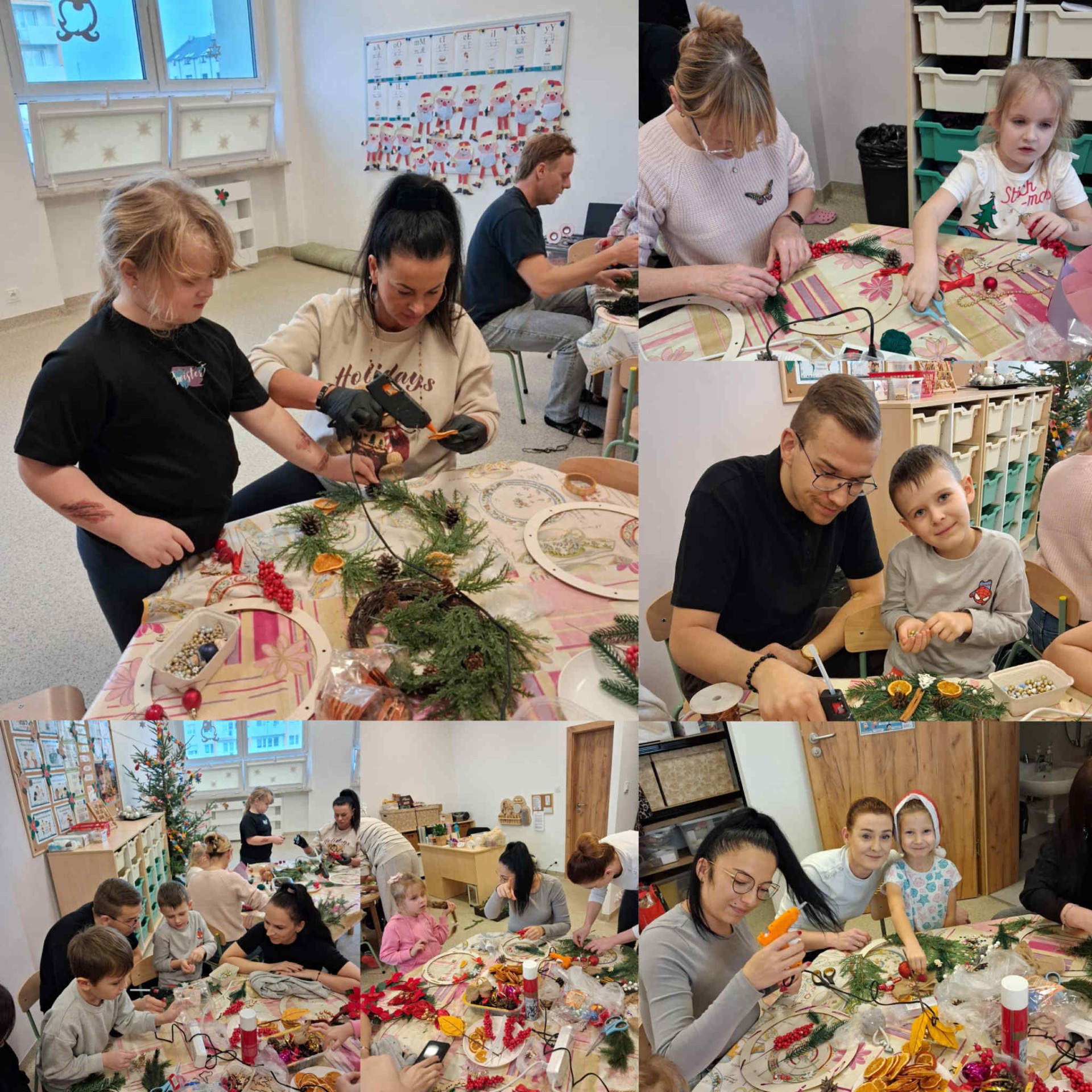 Dzieci wraz z rodzicami z ogromnym zaangażowaniem uczestniczyły w przygotowywaniu dekoracji, chętnie dzieląc się swoimi pomysłami i inspiracjami. Powstałe wianki okazały się wyjątkowe, niepowtarzalne i pełne świątecznego uroku.