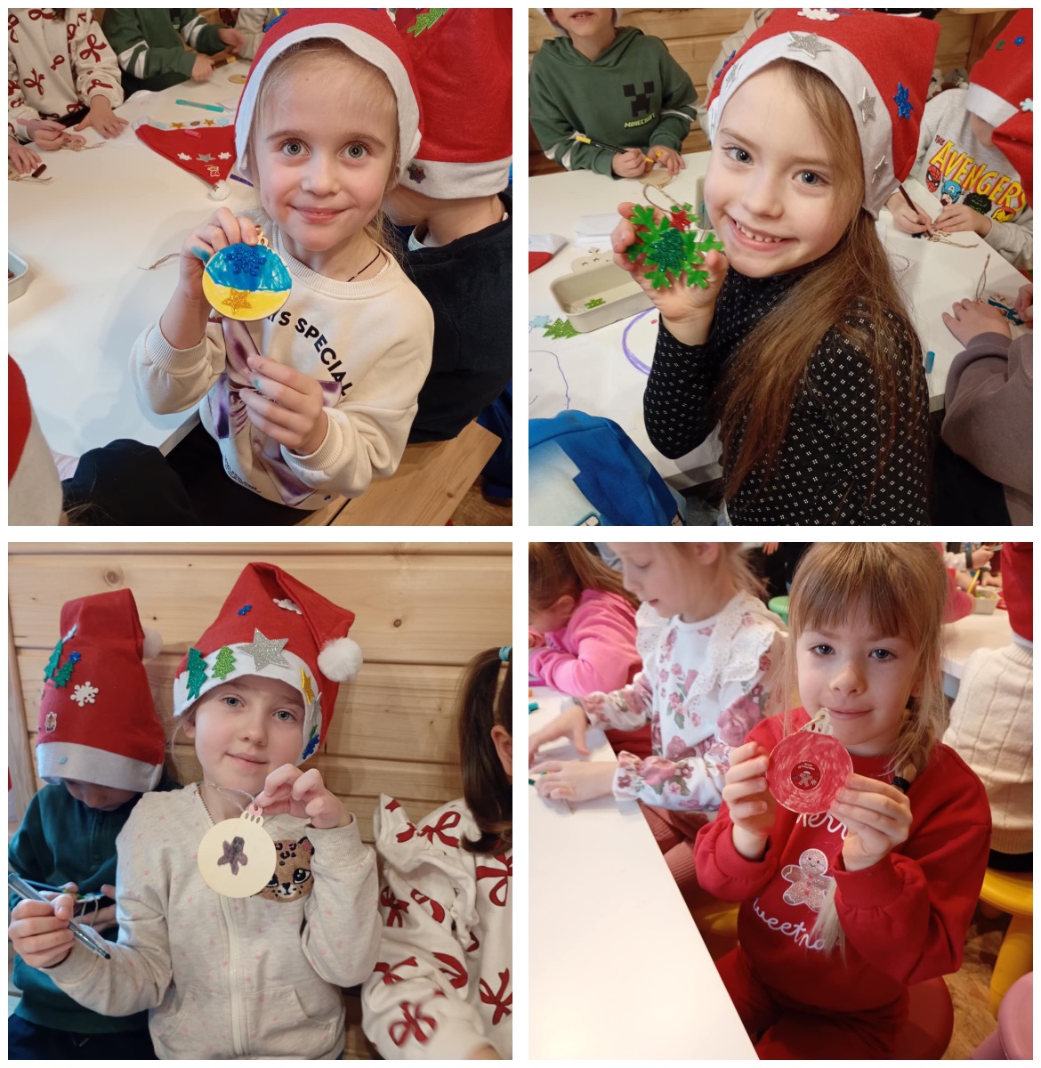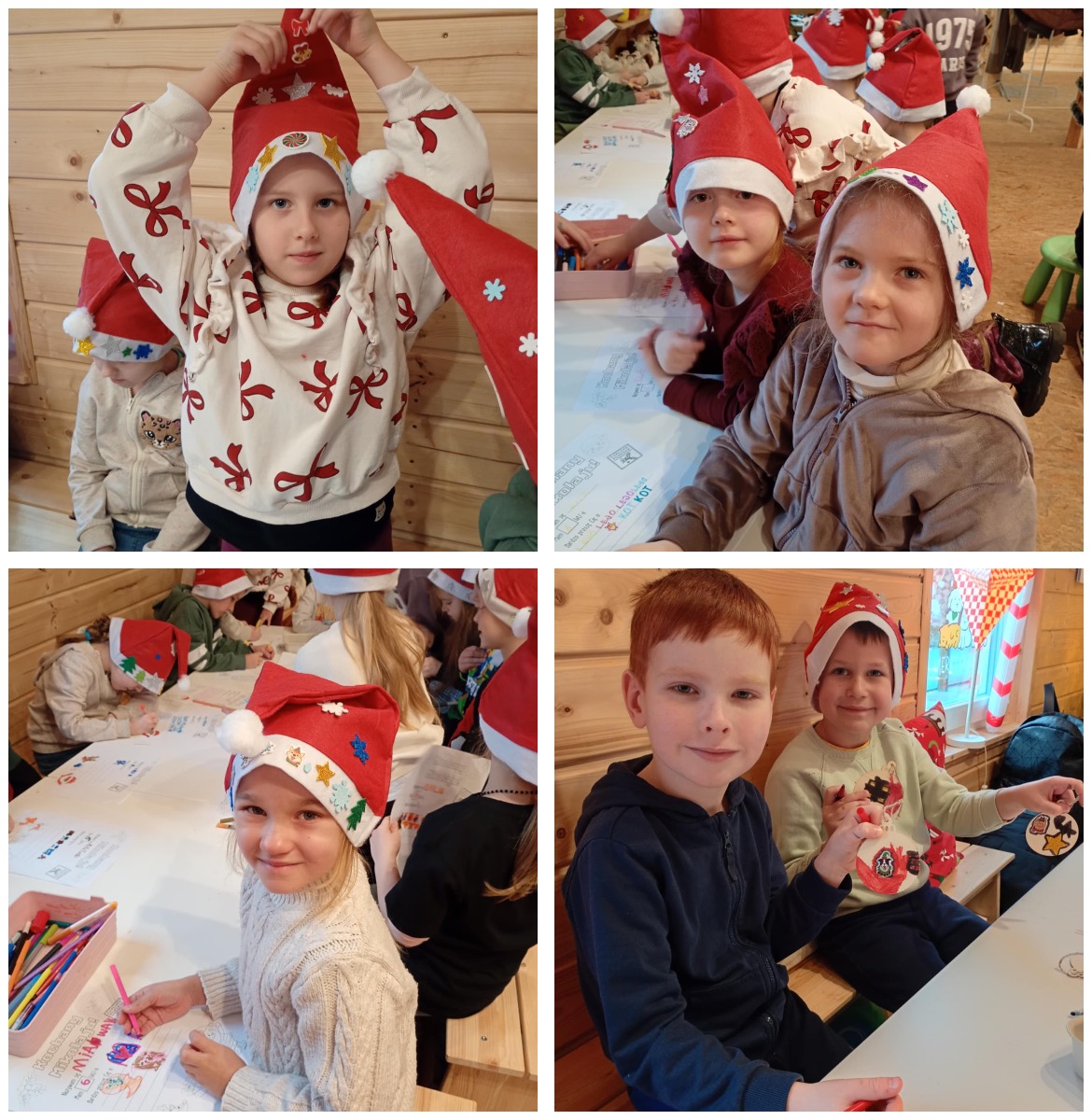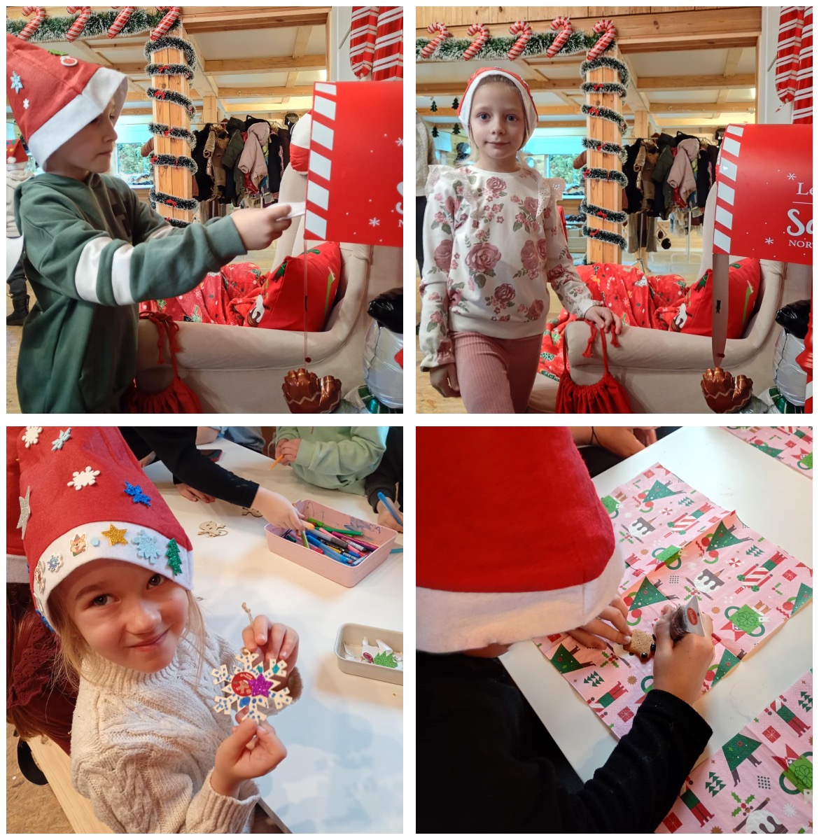 W trakcie wycieczki dzieci rozwijały umiejętność współdziałania w grupie rówieśniczej oraz pracy w parach daltońskich, wspólnie wykonując świąteczne zadania. Dużo emocji wzbudziło pisanie listów do Gwiazdora, które pobudzało wyobraźnię i twórcze myślenie. Nie zabrakło również pysznych atrakcji – przedszkolaki z radością piły świąteczne kakao oraz z wielkim zaangażowaniem dekorowały pierniki, tworząc własne, kolorowe słodkości. Największym przeżyciem okazało się spotkanie ze Świętym Mikołajem, który obdarzył dzieci ciepłym słowem i świąteczną życzliwością.